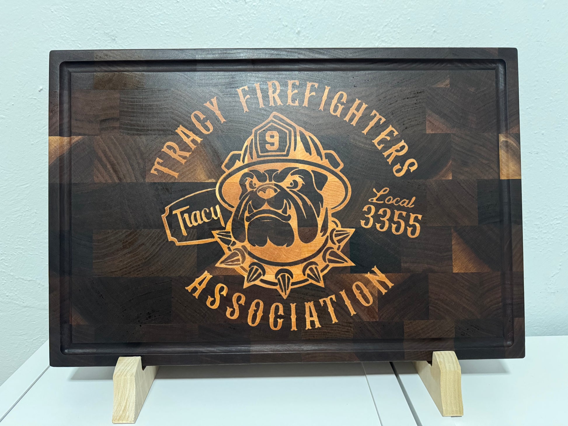 We offer custom inlay cutting boards. The example below was made for a fund raiser benefiting the Tracy Firefighters. The main board is walnut and is 18" x 12" x 1.5". The inlay is maple and goes down approximately 1/4". This board features a juice groove around the perimeter. A custom order includes review and re-working of artwork.