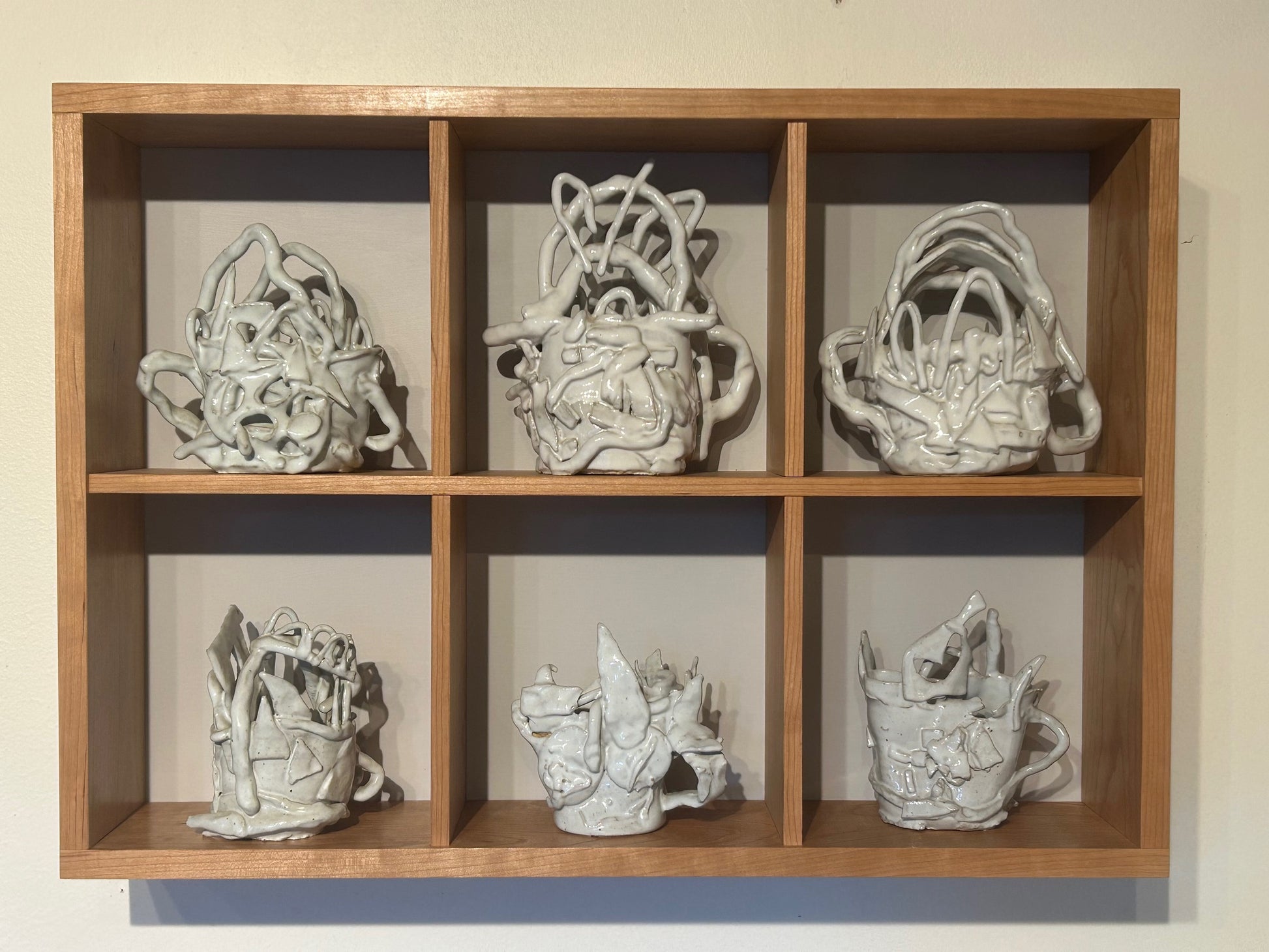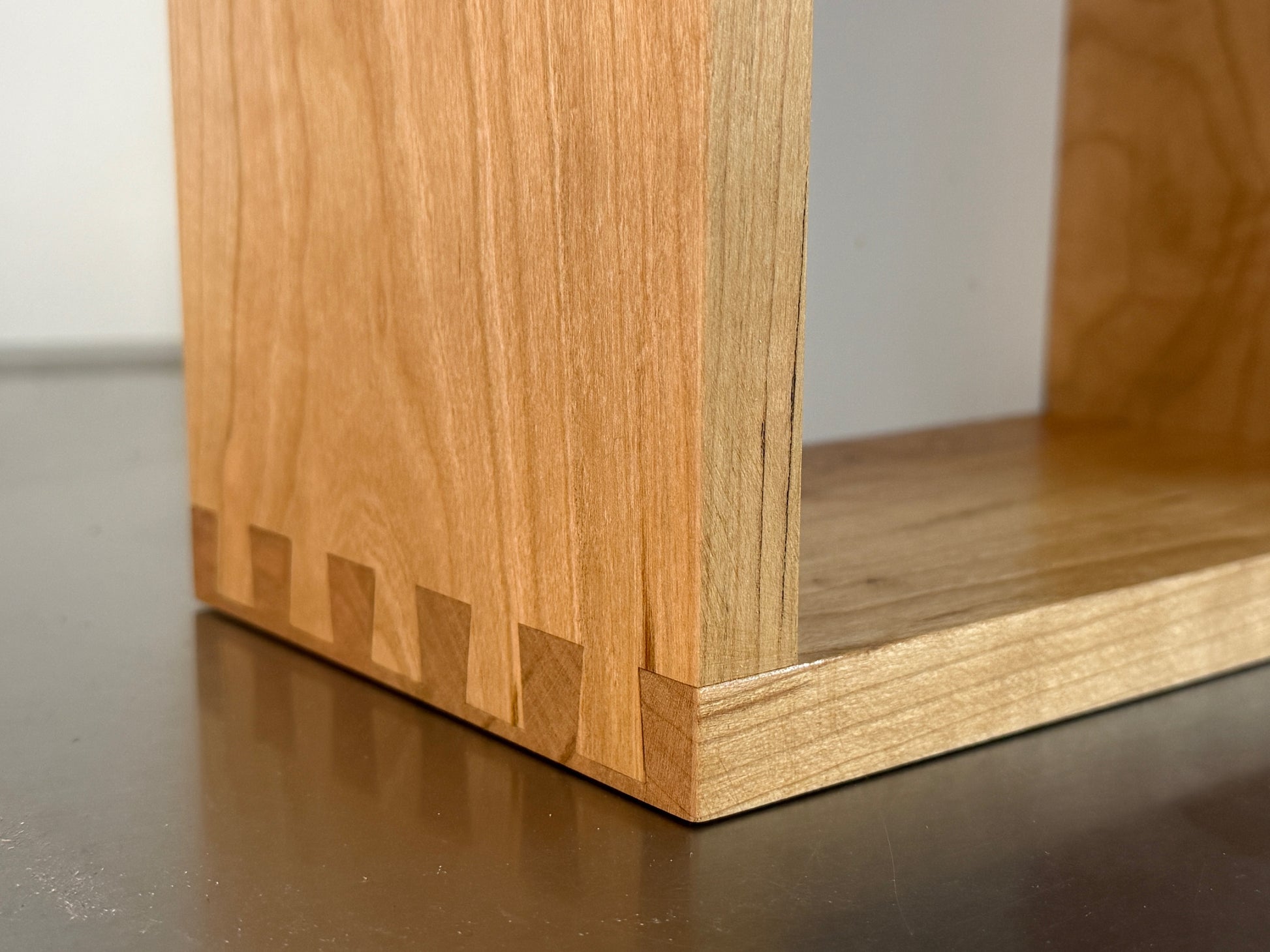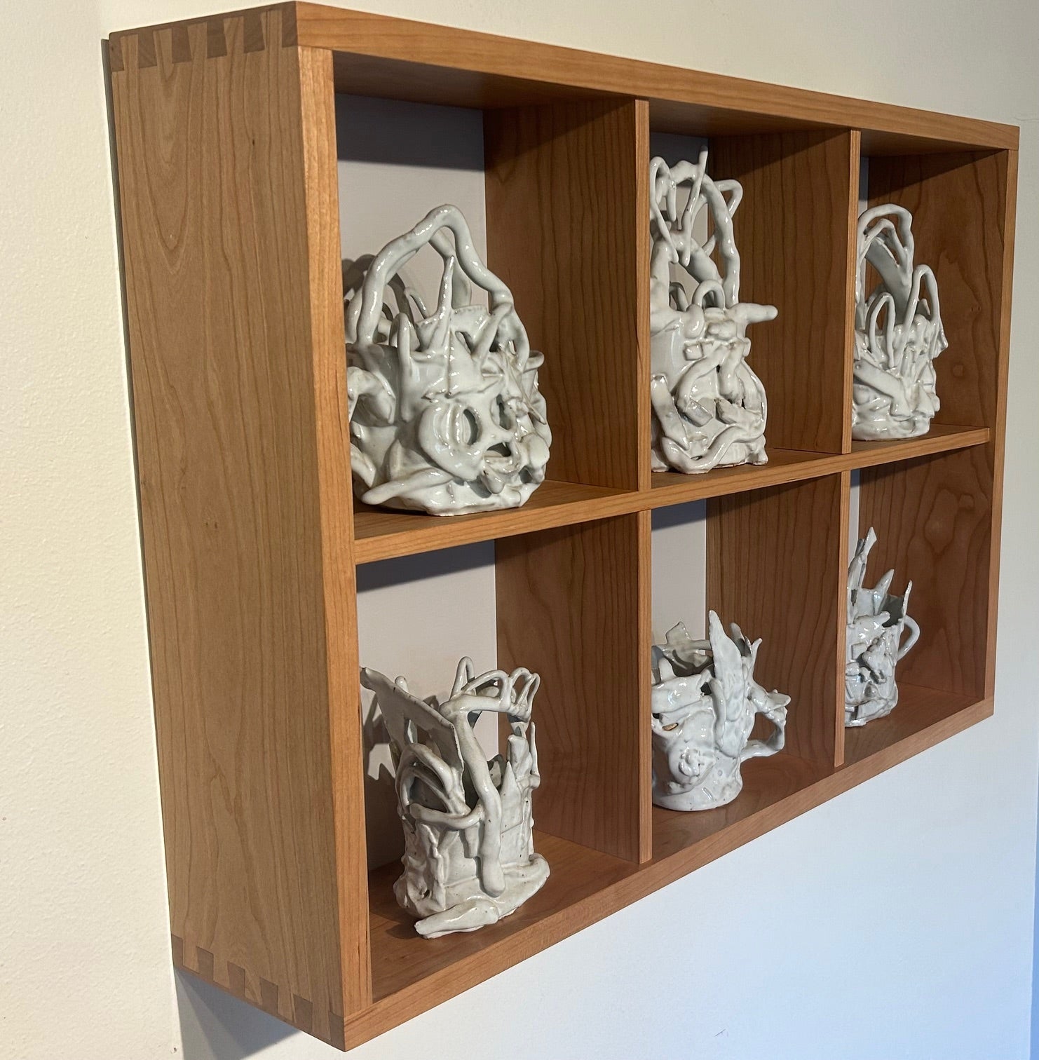 Shelves custom made to display six ceramic pieces. All cherry construction. Half-blind dovetail joints.